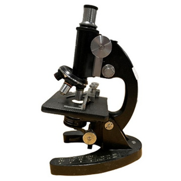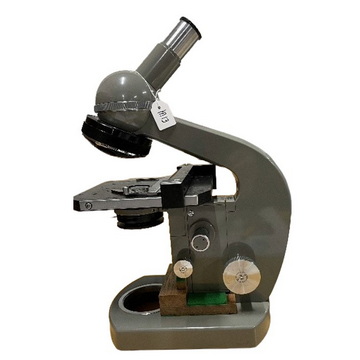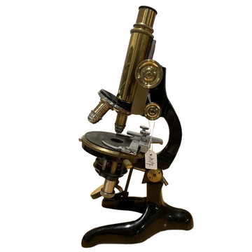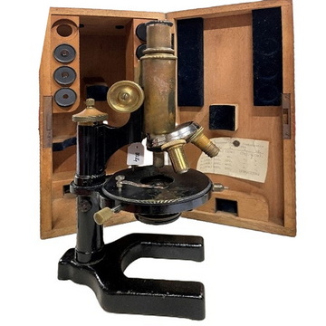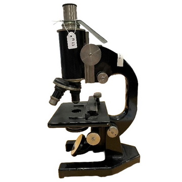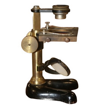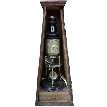 Messing, ca 15 cm hoog. Merk onbekend; Engels. Mono-oculair; 1 vast objectief, 1 oculair, spiegel, Geen fijninstelling; tubus wordt geschoven. Onder de voetplaat inscriptie: Sandford. Sandford is een dorpje in Devon (VK). Geen relatie met de Leidse hoogleraren Sandifort: de “i” ontbreekt en de laatste letter van de inscriptie is een d.) Rond 1845 schafte professor Pieter Harting (1812-1885) in Utrecht de eerste universiteits-microscoop aan en richtte een microscopiepracticum in voor studenten. Zijn microscoop, die nog te bewonderen is in het Utrechts Universiteitsmuseum, is vergelijkbaar met dit type. Zie ook M16.